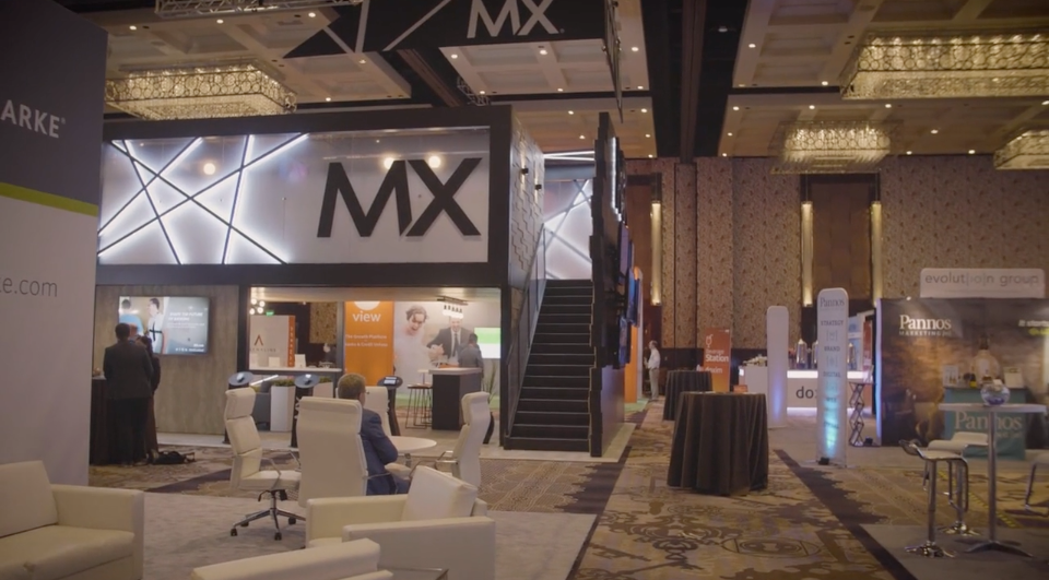 The identity also extended to MX's flagship annual conference, where I created a new event logo and full sub-brand for clients, peers, and investors. A 20×20 double-decker trade show booth followed, directly inspired by MX's corporate offices — black concrete and warm oak translated into a modular, travel-ready environment that felt unmistakably on-brand.